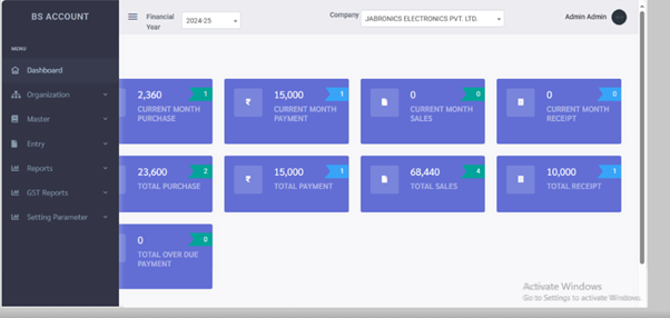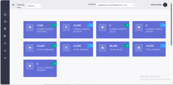 - Displays monthly and yearly data for sales, receipts, purchases, and payments.