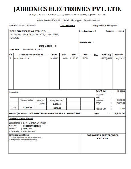 The system automatically generates an E-Invoice in compliance with government regulations (e.g., GST in India), which includes:- Unique Invoice Number